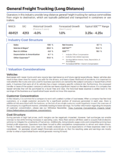 Download this Industry Insight to Learn how factors such as vehicles, customer concentration, and cost structure affect the value of the General Freight Trucking (Long Distance) industry. Download NowFirst Name*Last Name*Company Name*Title*Email*