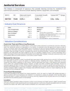 Download this Industry Insight to Learn how factors such as customer type and recurring revenue, demand for services, franchised businesses, and location affect the value of the Janitorial Services industry. CommentsThis field is for validation purposes and should be left unchanged.Download NowFirst Name*Last Name*Company Name*Title*Email*